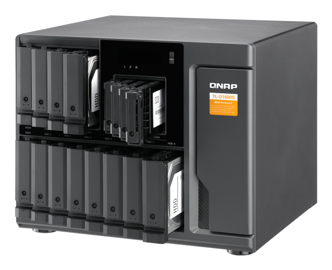 QNAP TL-D1600S to wysokowydajna jednostka rozszerzająca typu JBOD (Just a Bunch Of Disks), która umożliwia znaczącą rozbudowę pojemności pamięci masowej. Zaprojektowana z myślą o serwerach QNAP NAS, komputerach z systemem Windows® i Ubuntu® oraz serwerach, oferuje szesnaście zatok na dyski SATA 6 Gb/s, w tym dwanaście dla dysków 3,5″ i cztery dla dysków 2,5″. Połączenie z systemem hosta realizowane jest za pomocą interfejsu SFF-8088 (lub SFF-8644) poprzez dołączoną kartę QXP PCIe, co zapewnia transfer danych z prędkością do 24 Gb/s. Urządzenie wspiera funkcję hot-swap, umożliwiając wymianę dysków bez konieczności wyłączania systemu.